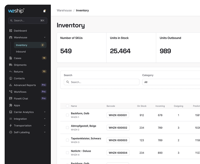 Dein Shop, deine Waren – unser Lager ist dein Lager. Wir finden die optimale Bestandsplatzierung in beiden Fulfillment-Centern, damit du effizienter skalieren kannst – um die Liefergeschwindigkeit zu erhöhen und Versandkosten zu senken. Alle Daten rund ums Lager werden elektronisch erfasst und sind in Echtzeit abrufbar. Sämtliche Prozesse sind jederzeit sichtbar und deine Kunden können ihre Bestellung sofort tracken. Alle Bestellungen werden vollautomatisch synchronisiert. Mit den praktischen Statistiken hast du auch alles im Überblick.